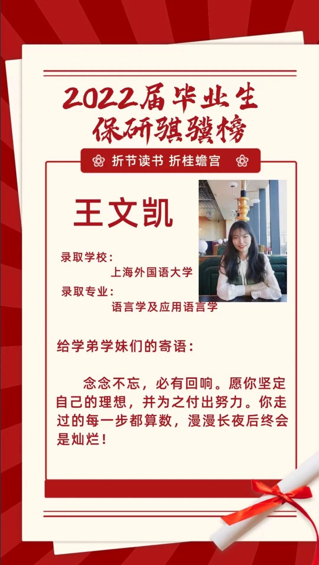 披星戴月路,终见长安花。2022年,bw必威西汉姆联19名本科毕业生成功保研,59名顺利考研进入理想高等学府深造,6名获得留学资格,1名硕士毕业生成功考博。