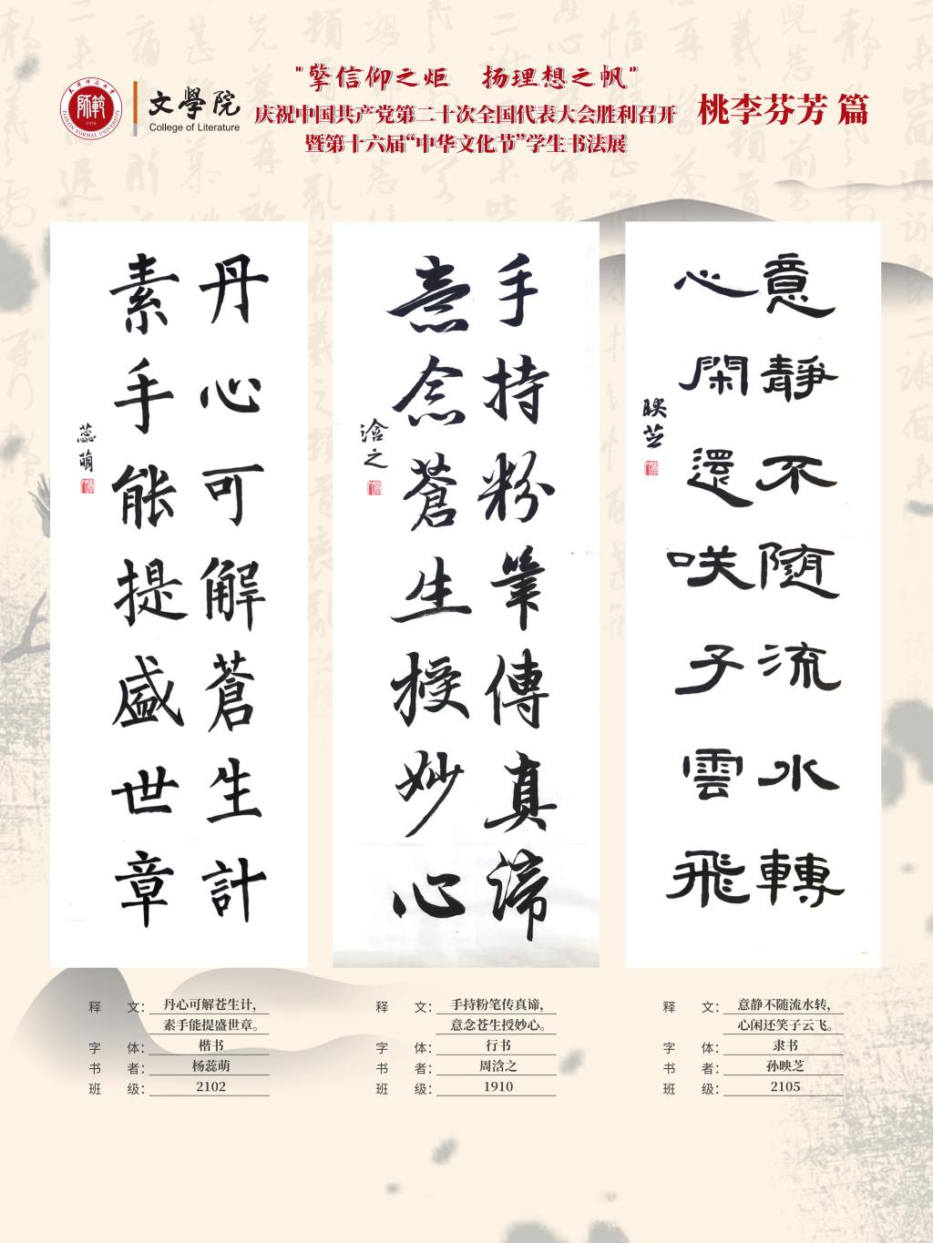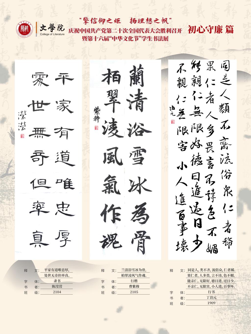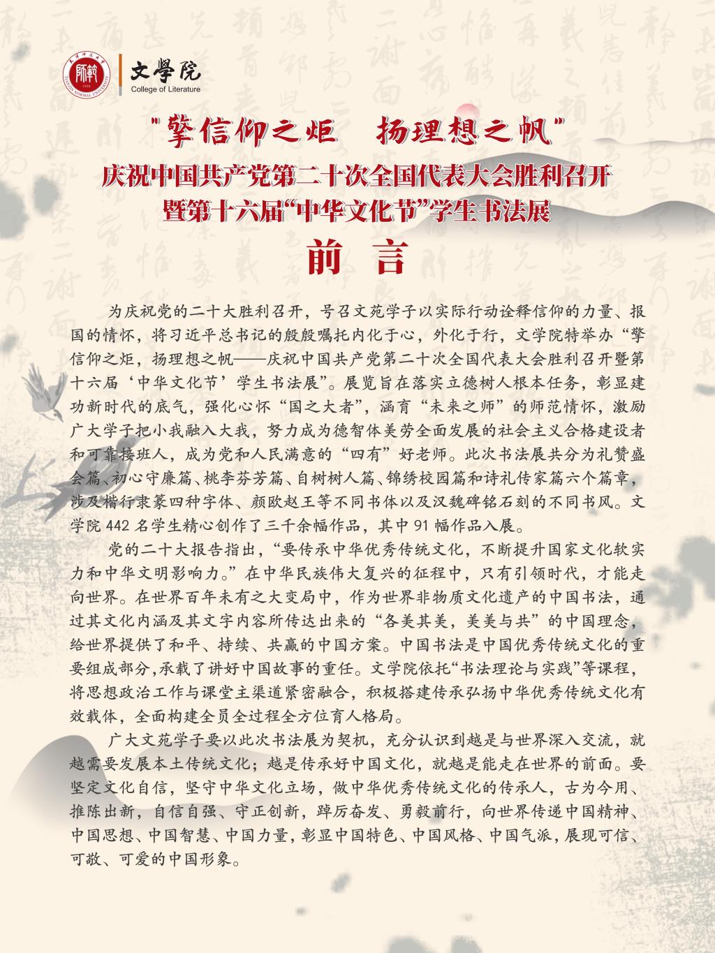 为深入学习宣传贯彻党的二十大精神,将习近平总书记的殷殷嘱托内化于心,外化于行,以实际行动诠释信仰力量、抒发报国情怀,bw必威西汉姆联举办“擎信仰之炬,扬理想之帆——庆祝党的二十大胜利召开暨第十六届‘中华文化节’学生书法展”。书法展分为礼赞盛会篇、初心守廉篇、桃李芬芳篇、自树树人篇、锦绣校园篇和诗礼传家篇六个篇章,旨在落实立德树人根本任务,彰显建功新时代的底气、志气、骨气,强化心怀“国之大者”、涵育“未来之师”的师范情怀,激励广大学子把小我融入大我,努力成为德智体美劳全面发展的社会主义合格建设者和可靠接班人,成为党和人民满意的“四有”好老师。