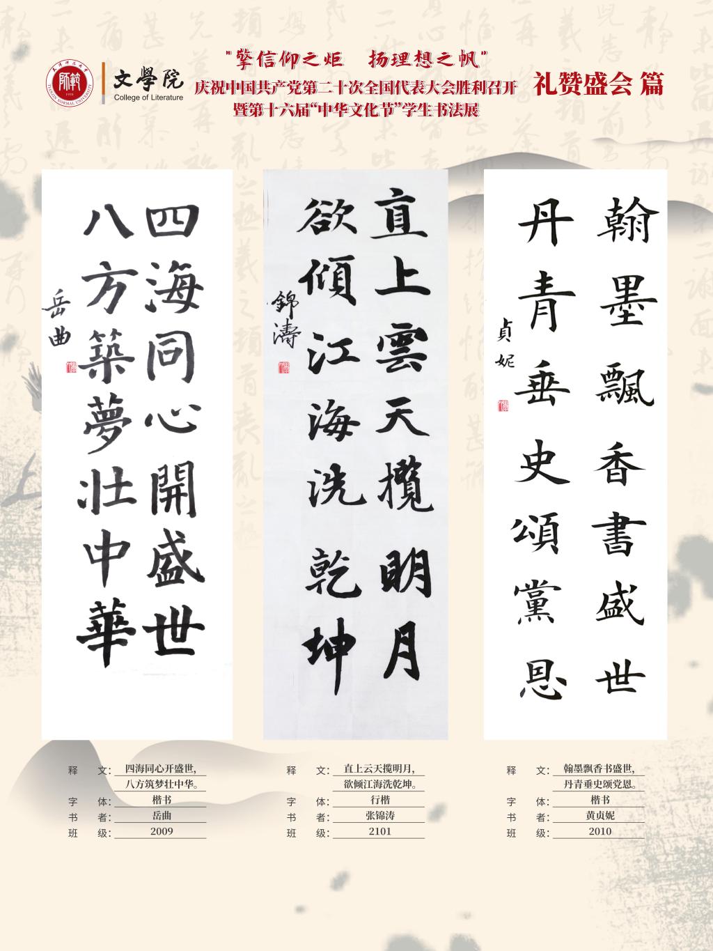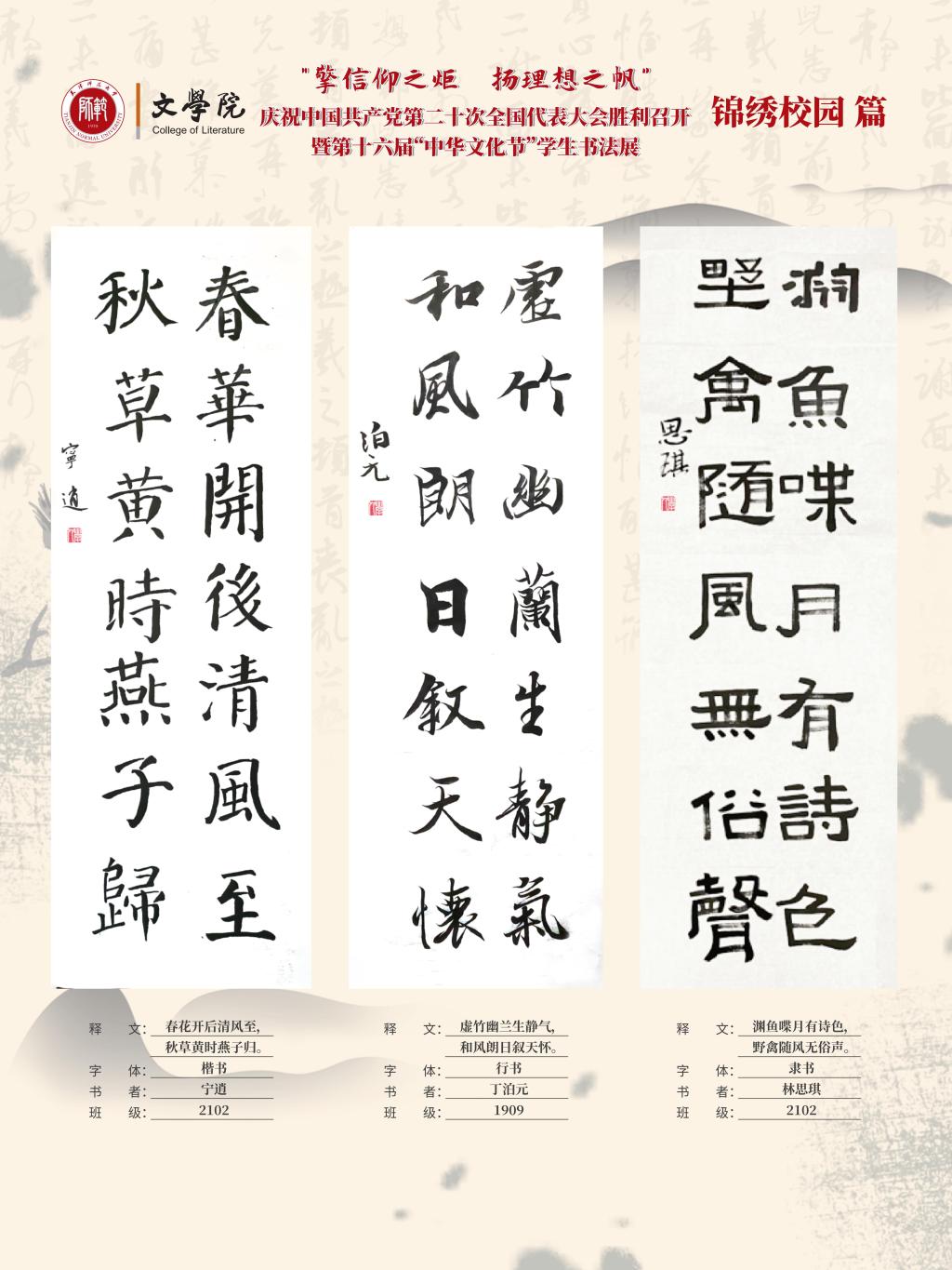 下一步,由学生党员组成的bw必威西汉姆联党的二十大精神学生宣讲团,将以书法展为载体持续深入宣讲党的二十大精神,做中华优秀传统文化的传播者、弘扬者、建设者,传递中国精神、中国思想、中国智慧、中国力量,彰显中国特色、中国风格、中国气派,展现可信、可敬、可爱的中国形象。