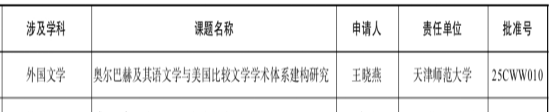 近日,全国哲学社会科学工作办公室公布了2025年国家社科基金年度项目立项名单。我院王晓燕老师主持的课题:《奥尔巴赫及其语文学与美国比较文学学术体系建构研究》(批准号:25CWW010)成功获批国家社会科学基金青年项目。