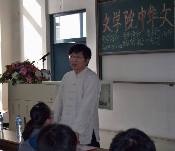 (许椿老师后任我校新闻传播学院广告系主任,2011年12月因病逝世。图为2011年3月17日许先生来我院“益言堂”学生论坛做首场报告“我的中文情结”。)
