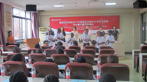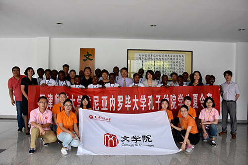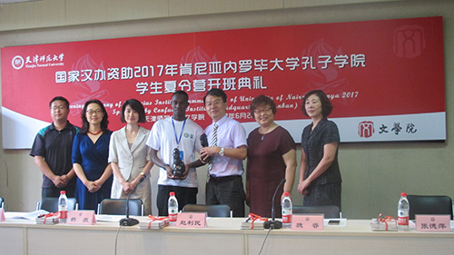 最后,肯尼亚内罗毕大学孔子学院学员莫英泽用流利的中文代表此次夏令营的十九名学生进行了演讲,他用中文向在座的同学和老师问好,向此次夏令营的教师及其他工作人员表示衷心的感谢。他还代表所有肯尼亚孔子学院的学员们向我院赠送了肯尼亚特产黑木雕。在开班仪式的最后,领导及老师们向学员代表赠送了纪念品。开班仪式结束后,所有出席领导、老师和夏令营全体学员在兴文楼大厅合影留念。