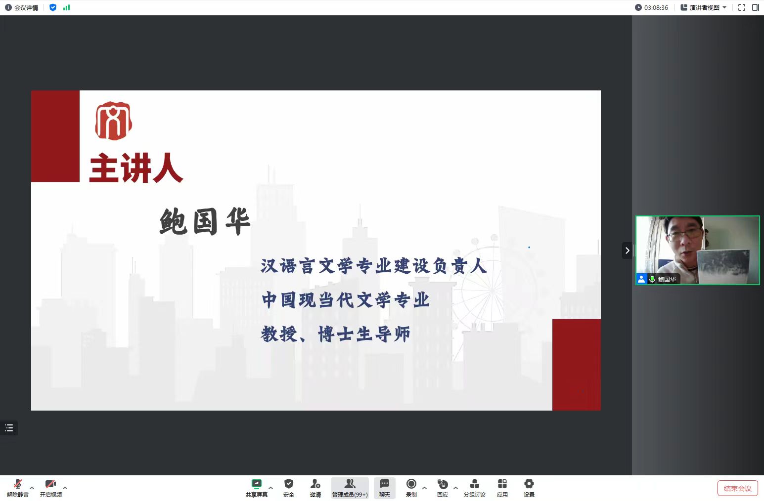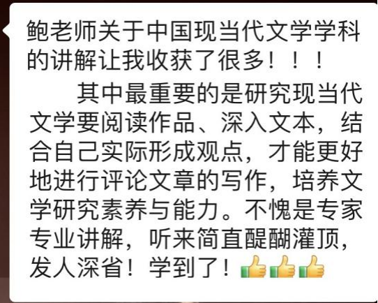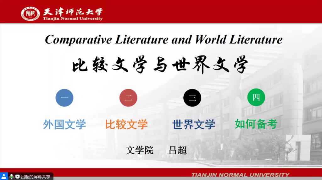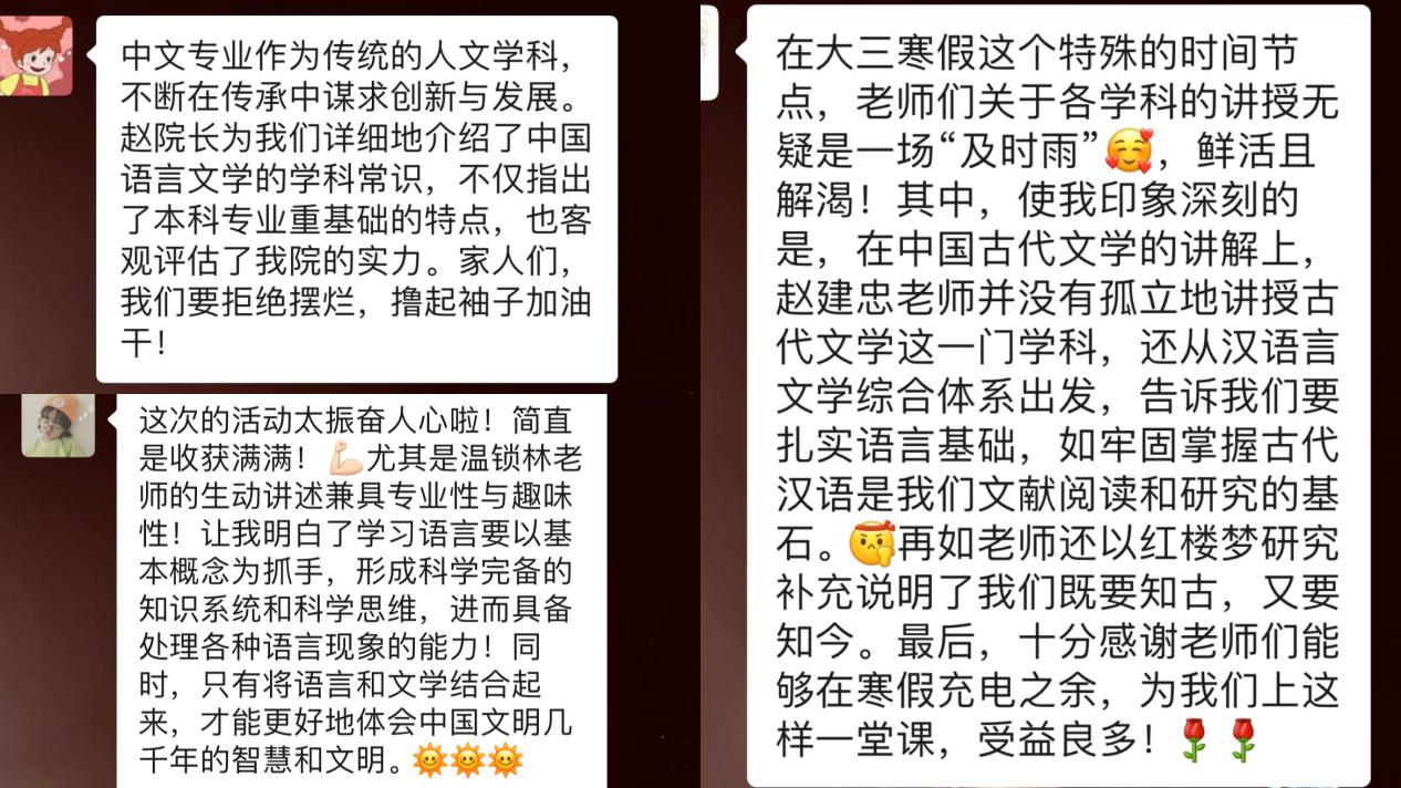 汉语言文字学学科带头人、博士生导师温锁林教授通过举例分析,提出了“重视基础概念、锻炼应用能力”的学习建议。中国古代文学学科带头人、博士生导师赵建忠教授在对中国古代文学学科进行概述的基础上,重点阐述了在学习中要将“多本教材观点融会贯通”的重要性。汉语言文学专业建设负责人、中国现当代文学专业博士生导师鲍国华教授强调了阅读文学经典作品的必要性,建议同学们在了解经典作品的基础上科学提炼,形成自己的学术观点。中国文学系主任、比较文学与世界文学专业博士生导师吕超教授以“外国文学”“世界文学”“比较文学”三个关键词为切入点,详细介绍了比较文学与世界文学的研究内容。文学理论教研室主任、文艺学专业硕士生导师赵欣副教授在对文艺学学科进行简要介绍之后,建议同学们在学习中要重视“时间顺序和逻辑线索”,才能做到学有所获。