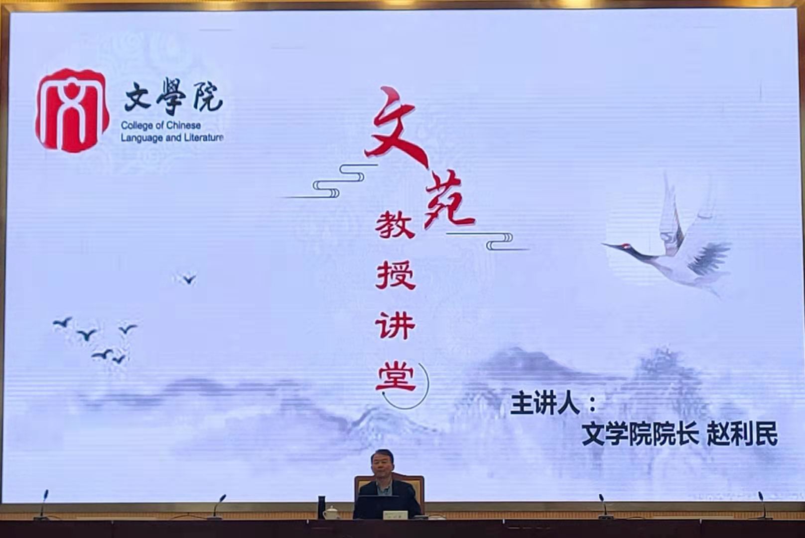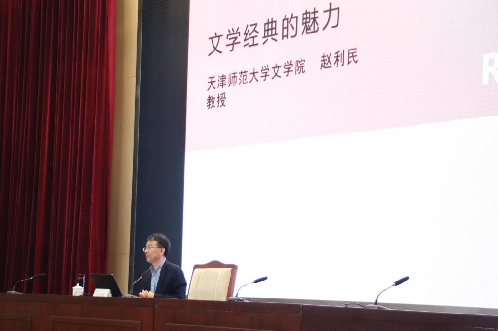 赵利民教授以《文学经典的魅力》为题,围绕“为何需要经典”和“文学经典的标准”两个主题进行漫谈。首先,他以歌曲《在水一方》引入讲座。《在水一方》歌词取自两千多年前的名篇《诗经·蒹葭》,这是千年前的声音,却依然传唱于今,由此引入讲座的主题——经典。