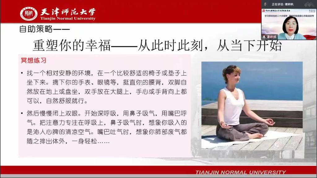 谭婷婷老师以党的二十大报告为中心,围绕习近平总书记强调的“重视心理健康和精神卫生”得出启示:要密切关注青年大学生的心理健康问题,特别是当前处于后疫情时代,社会心理健康更是备受关注的问题。从理论与实践两方面入手,教会同学们准确识别生活中无处不在的压力,还通过压力与健康的关系、“生命健康”等学术模型图清晰呈现了压力对心理健康和工作效率的深刻影响,让全体同学意识到缓解压力的重要性。谭老师从生理、情绪、行为这三个方面介绍了三种压力管理策略,比如放松训练、情绪调节、习得“扫除力”等方法,并带领大家进行了冥想练习,有效帮助同学们构建了积极健康的备考心理状态。