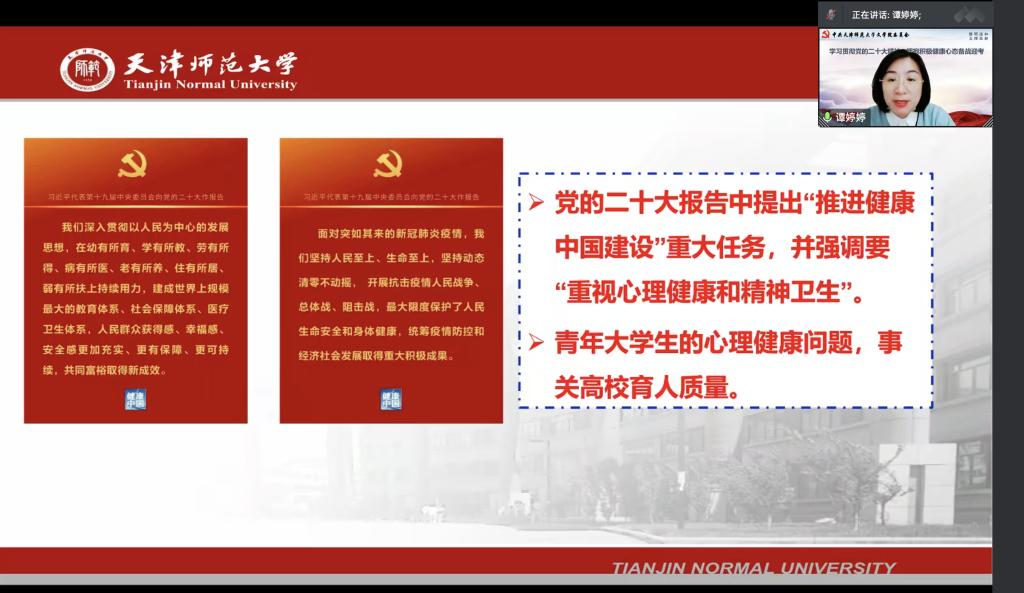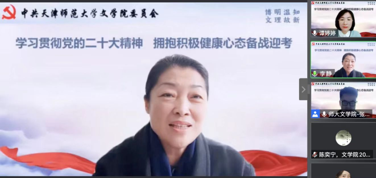 为持续深入学习宣传贯彻党的二十大精神,落实党的二十大报告中提出“推进健康中国建设”的重大任务,全面做好习近平总书记强调的“重视心理健康和精神卫生”工作。值此考研和期末考试来临之际,为更好的帮助缓解同学们考前焦虑情绪建立积极健康心态,bw必威西汉姆联党委邀请天津大学心理健康中心谭婷婷老师作“学习贯彻党的二十大精神,拥抱积极健康心态备战迎考”的云端报告会。学院党委书记李静出席并讲话,各学生党支部书记、学生党员、入党积极分子等300余人线上聆听了报告。