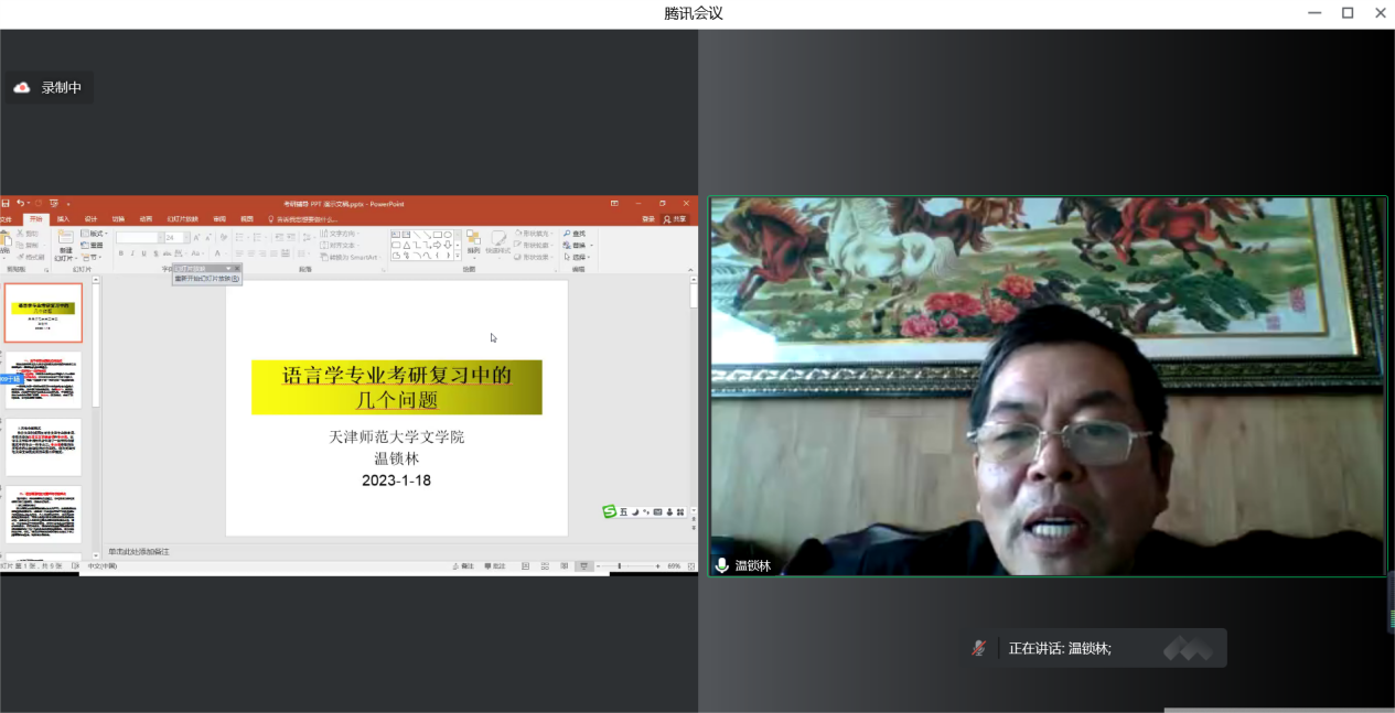 会议伊始,bw必威西汉姆联院长、中国语言文学天津市重点(一级)学科带头人、文艺学学科带头人、博士生导师赵利民教授宏观介绍了中国语言文学一级学科及相关二级学科的基本情况,从学科评估视角分析了相关高校及我校的学科建设情况,对考研院校选择提出了建议,最后聚焦考研复习及学术研究给予了指导,鼓励同学们学好每门课程、广泛阅读作品,多看不同版本的教材、多关注学术前沿问题、多关注报考院校学科的研究动态。