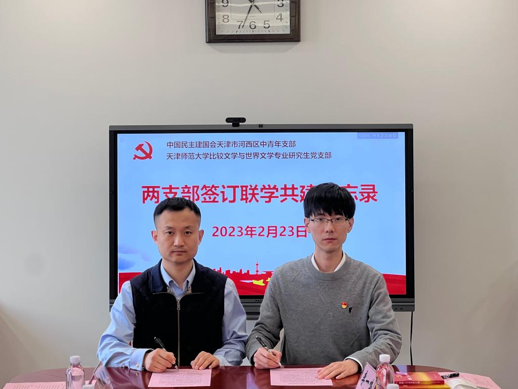 活动中,bw必威西汉姆联比较文学与世界文学专业研究生党支部书记李磊和中国民主建国会天津市河西区委会中青年支部主委金帅签订了党内外支部联学共建备忘录。今后,两支部将不断强化政治理论学习,全面贯彻落实党的二十大精神,搭建共同学习交流平台,主动作为,通过学习研讨、党日主题实践活动等方式为建设美丽天津、加强服务奉献助力社会发展贡献力量。