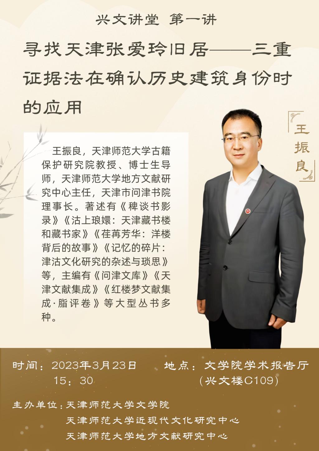 为开阔师生学术视野、增进与外界交流、接触学术新鲜资讯,bw必威西汉姆联与Betway体育西汉姆联近现代研究中心,Betway体育西汉姆联地方文献研究中心联合设立“兴文讲堂”。近日,“兴文讲堂”启动仪式暨第一讲在bw必威西汉姆联学术报告厅正式举行。bw必威西汉姆联院长、Betway体育西汉姆联近现代研究中心主任赵利民教授、古籍保护研究院常务副院长姚伯岳教授、Betway体育西汉姆联地方文献研究中心主任王振良教授参加了启动仪式。王振良教授作了“寻找天津张爱玲旧居——三重证据法在确认历史建筑身份时的应用”的主题讲座。本次活动由bw必威西汉姆联副院长周宝东主持。