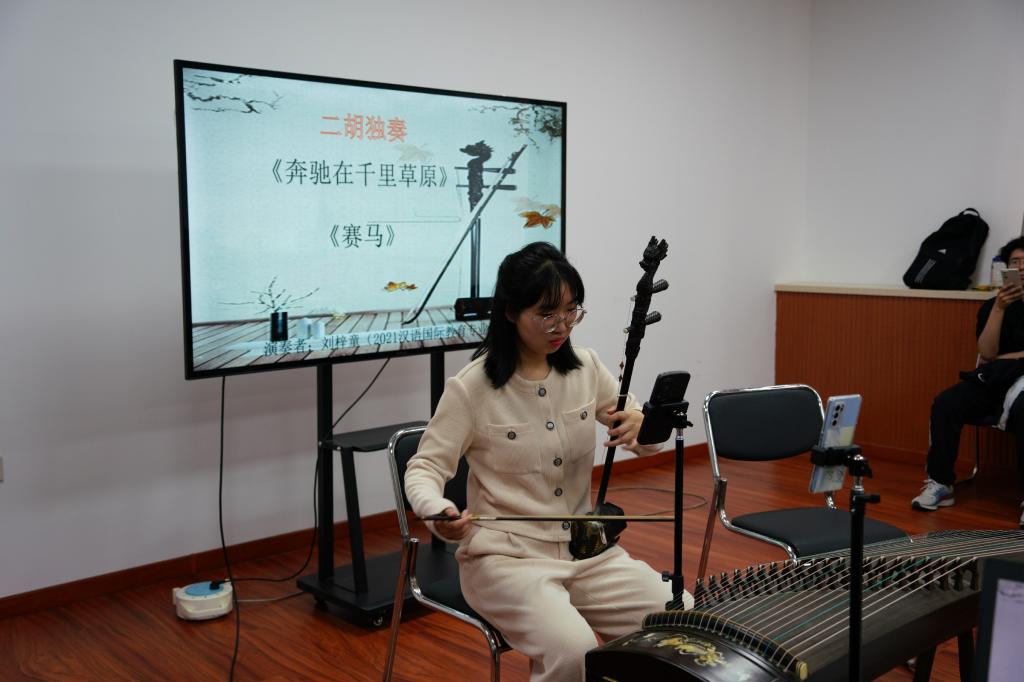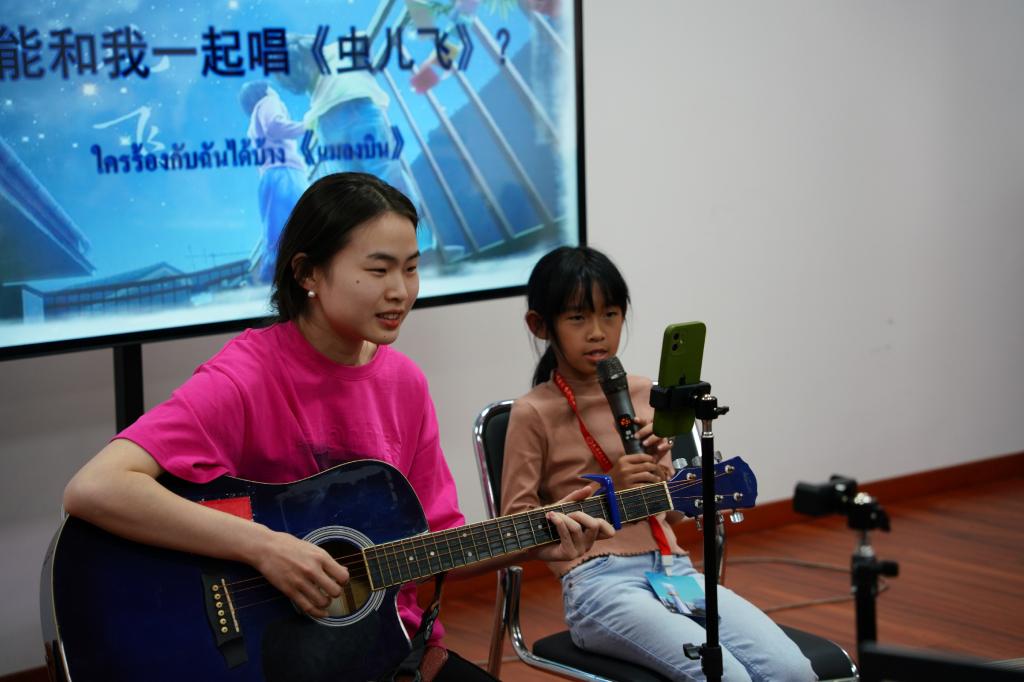 刘梓童的二胡独奏《奔驰在千里草原》《赛马》为整个活动开场,紧接着是董志斌和李岩朋同学带来的合唱《花房姑娘》,和声高昂,令全场气氛热烈。张梓睿演奏的古筝曲《临安遗恨》将全场带回到历史现场。杨晨演奏了一首大家都很熟悉的吉他曲《虫儿飞》,此时,泰国研学团年龄最小的朋友大胆举手与演奏者合唱。最后,泰国研学团成员与汉语国际教育专业的同学一起合唱欢快的《学猫叫》,大家一起伴着提前学习的手势舞合唱,整场活动在掌声中结束。
